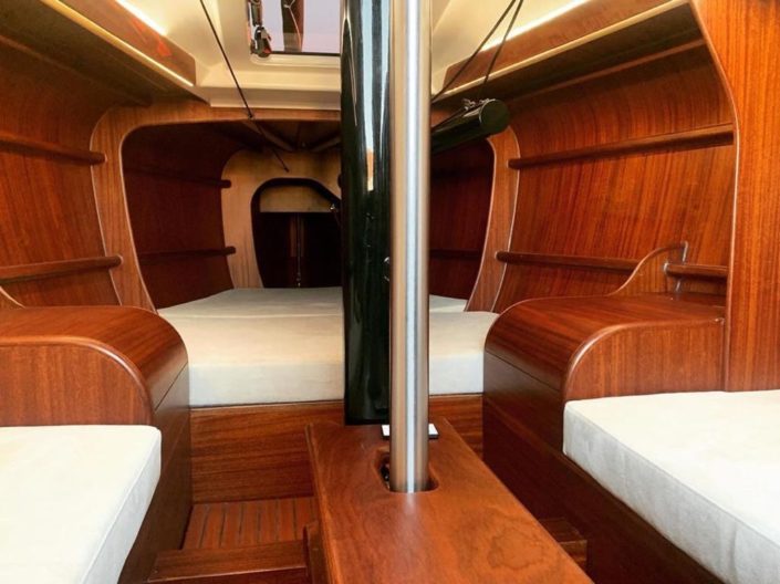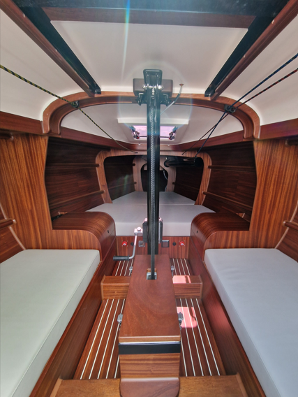 Hull and decks are built in cold molded wood with modern vacuum technology. The inner layers are made of Okume. The outer veneers are produced with selected Khaya.The deck is teak. The veneers are glued with top-quality epoxy resin.