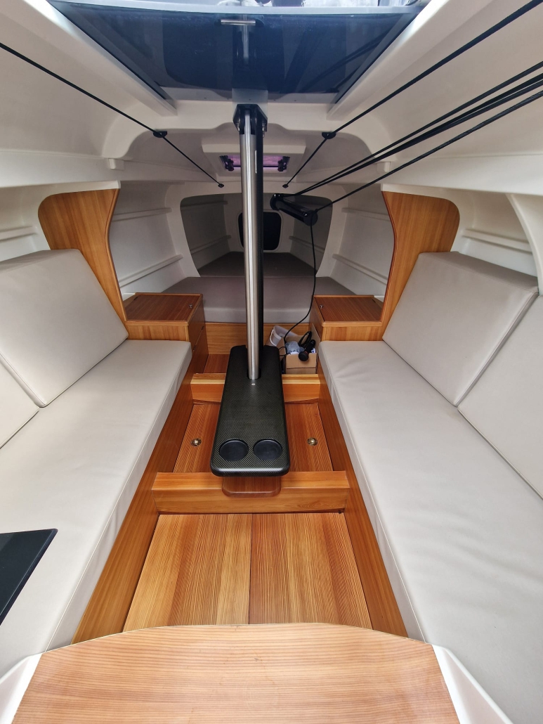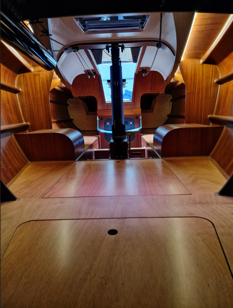 Bulkheads and furniture are made of warm mahogany marine plywood. Cushions etc will be made custom.