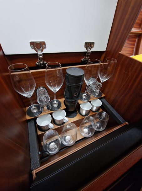 Salon bunk or rear bunk as seat and resting surface/partially under the outside bench (length 2,20 m) incl. two built-in cupboards on port and on the starboard side. Optional portable potty.